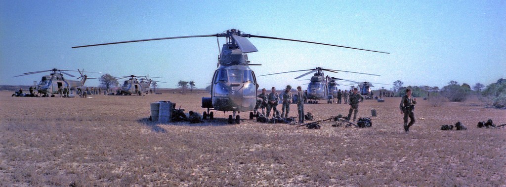 The entire assault force had been assembled in one of those islands, and coming in for landing we were treated to an exhilarating sight showing the scale of the operation with a number of South African Air Force Super Frelons, Pumas SA330 and piles of 44 gal. avgas drums dumped all around the bushes. The magnitude of Op ‘Uric’ had called for assistance from the SAAF. Here I ought to spare a thought of gratitude for the unwavering support their pilots never failed to provide us. Among the best ever to fly helicopters in combat.