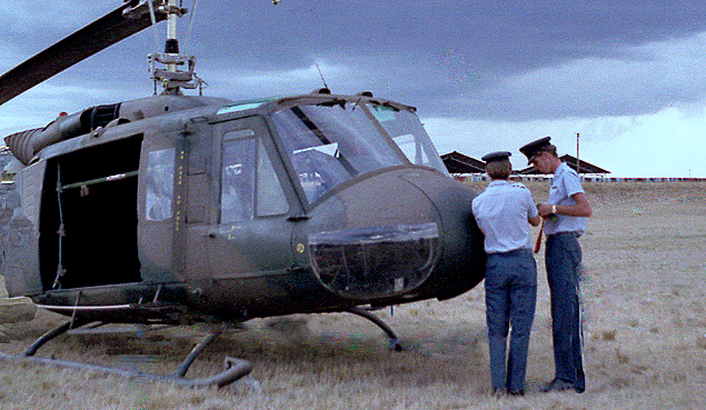 Wearily the personal kit is unloaded everyone makes his way unhurriedly across the air strip to the camp. The whining pitch of the choppers gradually lowers to a stop. Only silence now.